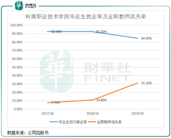 我们可以从另一个数据做该设想做支撑,那就是毕业生就业率和全职教师离职率。2019/2020学年,岭南职业技术学院毕业生初次就业率为84.5%,较2017/2018学年下降8个百分点,同期国内大专教育的总体平均初次就业率分别为78.2%、78.4%及78.6%,呈上升趋势。