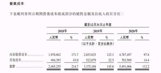 而高额营业成本的主要组成部分便是其内容服务成本。由招股书可知,2018年内容服务成本高达收入的171.7%,2019年及2020年营业成本占收入百分比有所降低,但仍分别维持在123.1%及97.8%的位置。