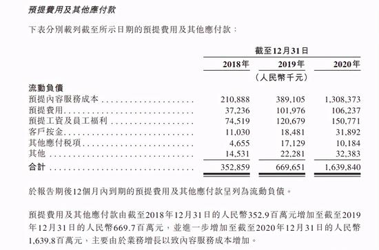 在网易云的流动负债中,近年来占比最高的依旧是预提内容服务成本。2020年网易云的预提内容服务成本飙升至约13亿元。招股书给出的解释是,“预提费用及其他应付款由截至2018年12月31日的人民币3.529亿元增加至截至2019年12月31日的人民币6.697亿元,并进一步增加至截至2020年12月31日的人民币16.398亿元,主要由于业务增长以致内容服务成本增加。”