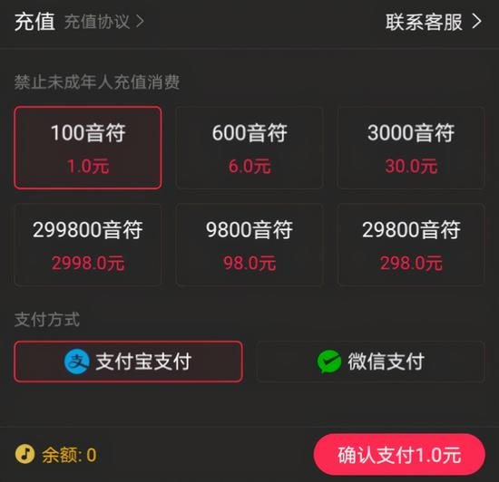 目前网易云音乐的对应价格是,1元购买100音符、6元购买600音符等。