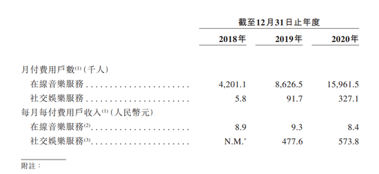 网易云的营收结构可主要分为两条业务线,即:通过销售在线音乐服务的会员订阅和销售社交娱乐服务的虚拟物品来变现。从招股书披露的表格可以看出,其在线音乐服务业务方面虽付费用户数多,但人均花费少。与之截然相反的是,社交娱乐服务业务方面虽付费用户数少,但人均花费则较高。