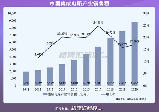 近年来,在国内外市场需求的拉动下,我国集成电路产业整体实现快速发展,销售额从2011年的1934亿元增至2020年的8848亿元,年均复合增长率达18.41%。