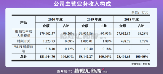 招股书显示,2018年至2020年,唯捷创芯实现营收2.84亿元、5.81亿元、18.01亿元,年复合增长率为152.48%,2019年以及2020年营收增幅分别为104.58%、211.53%,营收规模呈持续增长的趋势。