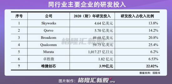 报告期内,唯捷创芯的研发总投入分别为1.20亿元、0.73亿元及4亿元,研发费用占营业收入的比例分别为42.13%、12.52%和22.02%,三年累计研发投入合计近6亿元。尽管公司在努力奋起直追,自主研发实现技术进步,但是由于资金不足,相较于国际厂商每年高达数亿美元的研发投入着实存在较大的差距。