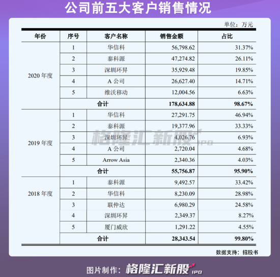 伴随着大环境的推波助澜,在唯捷创芯蒸蒸日上的业绩之下,值得关注的是,公司前五大客户销售额占比高达95%以上。公司的经营业绩与前五大客户的经营情况相关性较高,在当下终端竞争激烈,客户倘若市场份额下降或竞争地位发生重大变动,公司将面临订单减少或流失等风险,给公司造成不利影响。