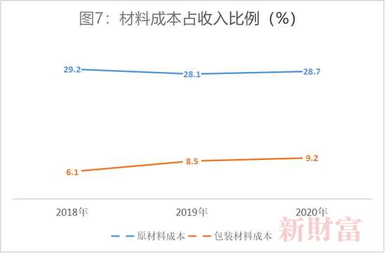 如果从另一种角度看,奈雪原材料成本占收入比例趋于稳定,而包装材料占收入比例一直在提高。2020年,包装材料成本占收入比例进一步提高至9.2%,比2018年增加超过50%,这个比例着实不低。
