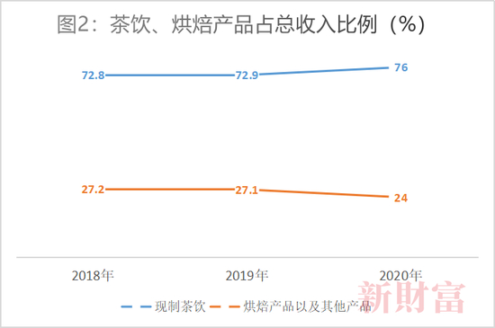 奈雪茶饮最高单价不到30元,客单价为43元,是因为喝茶时还选择烘焙品。2020年,其茶饮、烘焙产品分别占总收入的76%、24%。