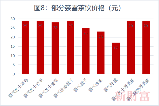 奈雪的微信小程序显示,奈雪“霸气”系列茶饮,只有一款低于20元,其他多在28-29元左右(图8)。霸气芝士草莓为奈雪人气爆款王产品,基本价为29元,消费者可以选择加料,其中“0卡糖”1元,“燃爆菌”4元,“水晶”2元。