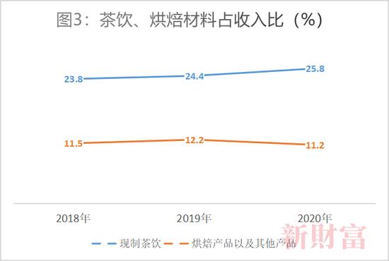 于是出现这种情况,即2018年、2019年、2020年,其烘焙品以及其他产品材料费支出为1.25、3.06、3.72亿元,贡献销售收入为2.96、6.77、7.34亿元。与之相对应的是现制茶饮,期内材料费支出分别为2.59、6.1、5.33亿元,贡献销售收入7.91、18.24、23.22亿元。