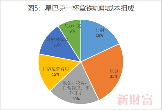 星巴克店租成本高昂已经不是秘密。在中国,一杯4.8美元的星巴克拿铁咖啡,拆解其成本组成,人力成本为0.41美元,原材料成本0.64美元,店租为1.25元,分别占比为9%、13%、26%(图5)。