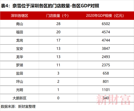 至6月19日,微信小程序显示,奈雪于深圳的门店已经有108家,南山和福田两大区共58个,超过一半;但大鹏、光明和盐田,数量仍然较少(表4)。