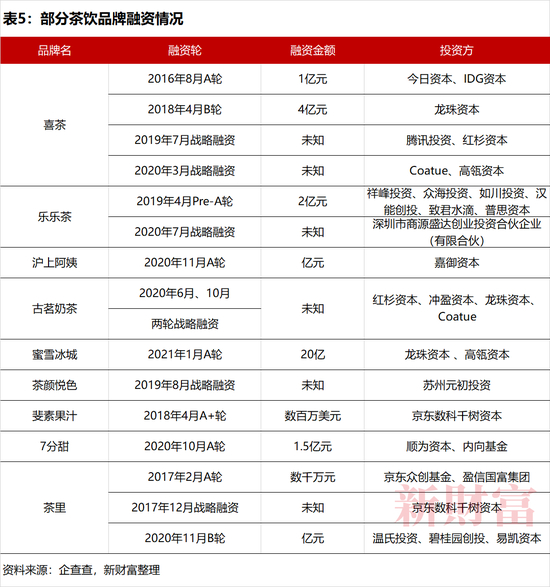 模式和价位基本相同,同为“新茶饮双雄”的喜茶,自2016年开始数次融资,最近两轮金额未透露,前后四次融资规模应不亚于奈雪。当初未能投资奈雪的今日资本,也转而扶持喜茶。2020年3月,喜茶完成由高领资本和Coatue联合领投的C轮融资(表5)。