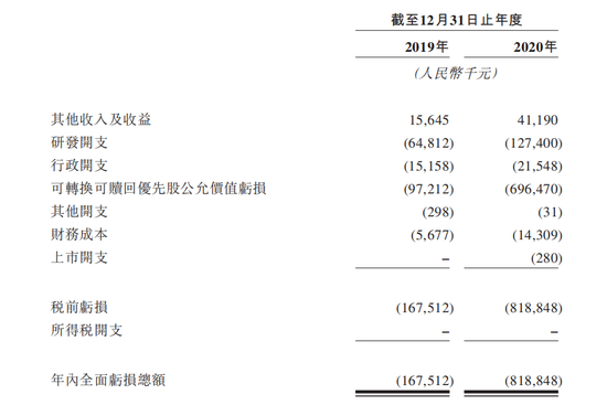 与港股生物医药板块众多企业类似,康诺亚全部产品均未实现商业化,不过已经产生了少量收入。招股书显示,康诺亚生物2019年、2020年营收分别为1565万元、4119万元。而从开支上来看,研发部分占绝对大头,分别6481万元、1.27亿元。另外,由于可转换可赎回优先股公允价值变动,康诺亚生物2019年、2020年年内全面亏损总额分别为1.67亿、8.19亿。