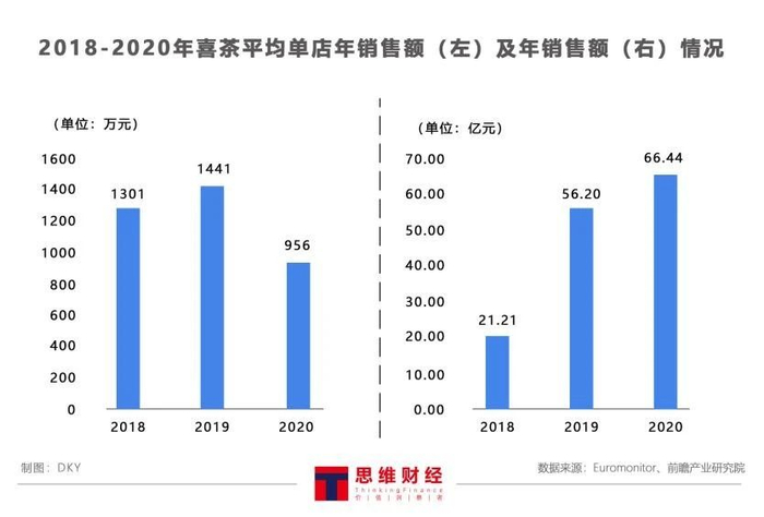 图——2018-2020年喜茶平均单店年销售额(左)及年销售额(右)情况(单位:万元,亿元)