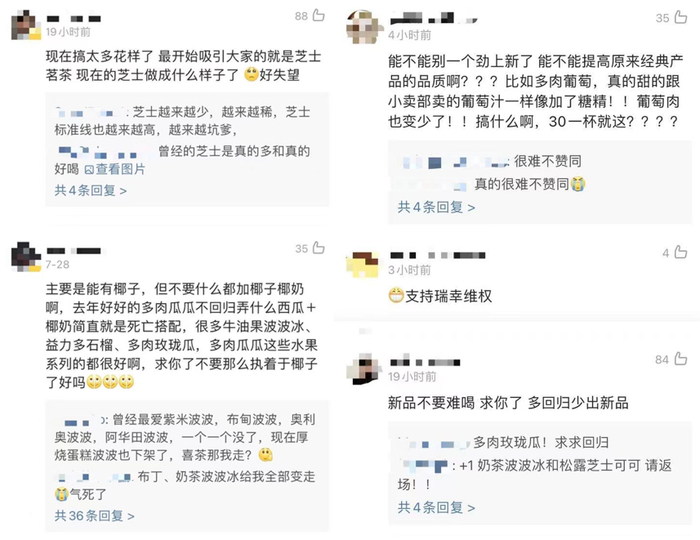 其次,上新产品过多引起部分消费者的不满,但这恰巧是喜茶认为的优势所在。喜茶在2020年度报告中提及,为保持领先的研发实力和研发品质,平均每1.2周就会推出一个新品。但值得注意的是,频繁上新的同时,喜茶也“急着”下架产品。喜茶的微博官方账号中,7月份声称下架的产品就约14种。除了因为时令水果成熟时间受限制以外,库存不足也是下架原因。喜茶是否对产品无计划上新和下架,是否因注重新产品而忽视核心产品质量,则不得而知。
