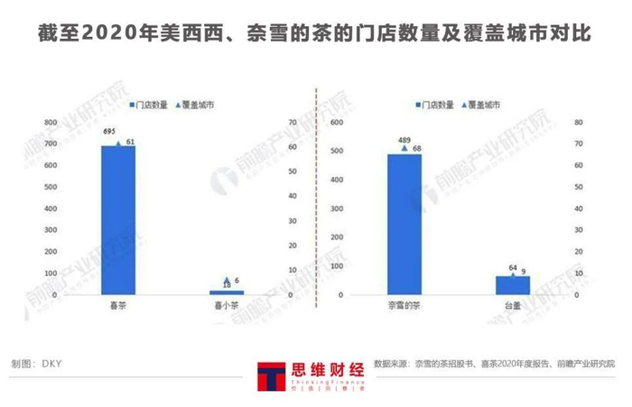 图——截至2020年美西西、奈雪的茶的门店数量及覆盖城市对比(单位:家,个)