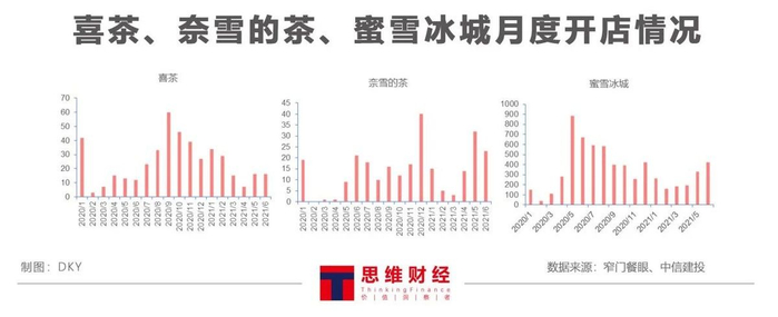 图——喜茶、奈雪的茶、蜜雪冰城月度开店情况