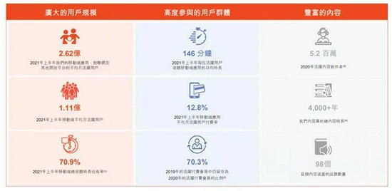 根据灼识咨询统计,喜马拉雅移动端主应用程序平均月活跃用户在中国在线音频应用程序中排名第一;截至2021年6月30日,移动端用户共花费8478亿分钟收听喜马拉雅平台的音频内容,约占中国所有在线音频平台移动端收听总时长的70.9%。