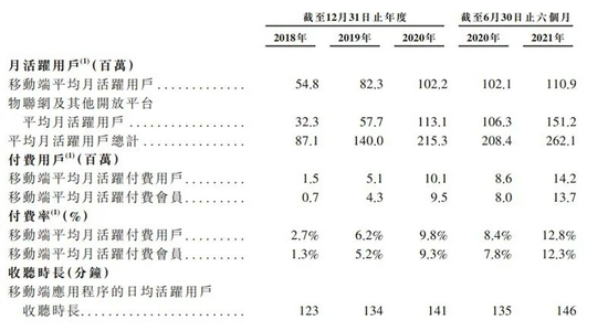 招股书显示,截至2021年6月30日,喜马拉雅平均月活跃用户数达到2.62亿,包括1.11亿移动端平均月活跃用户和1.51亿通过物联网及其他开放平台收听音频内容的平均月活跃用户。其中,移动端平均月活跃付费用户达到1420万,较2020年同期增长65.5%;付费率约为12.8%。平台音频内容总时长约21亿分钟。