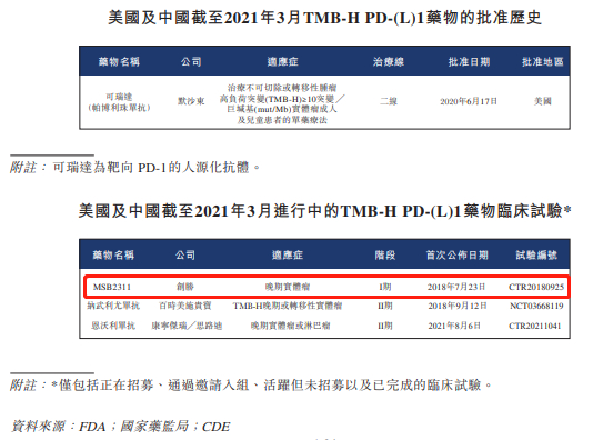 从产品端来看,截至2021年3月,仅有默沙东旗下的可瑞达获批在美国用于TMB-H实体瘤患者的二线治疗。而根据CDE的资料,在中国只有创胜的MSB2311正进行靶向TMB-H实体瘤患者的抗PD-L1药物临床试验。