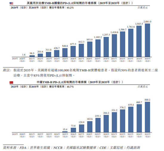 公司的核心产品MSB2311是一种用于治疗TMB-H肿瘤的PD-L1抗体,2020年全球TMB-H癌症的发病人数估计为975.1千人,预计2030年进一步增至1242.8千人;2020年中国发病人数估计为234.2千人,预估2030年增至291.9千人。美国及中国用于治疗TMB-H肿瘤的PD-L1抑制剂市场规模预计2035年将分别达到2081.0百万美元和500.2百万美元。