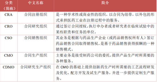 CDMO服务是一种新兴的研发生产外包组织,主要为医药企业以及生物技术公司的产品提供工艺开发及设备、工艺优化、注册和验证批生产以及商业化定制研发生产服务的机构。在生物制药领域,常见的医药外包服务有CRO、CSO、CMO和CDMO等。