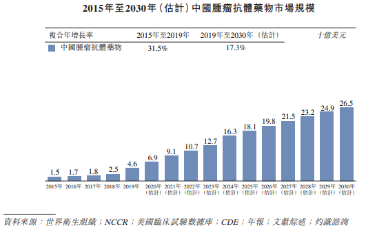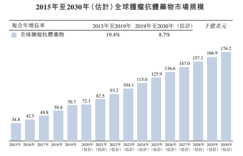 随着患者群体不断扩大、全球审批流程加快以及负担能力的提高,预计全球和中国的肿瘤抗体药物市场规模于2030年将分别达到1762亿美元和265亿美元。