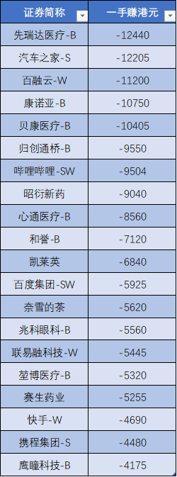 在2021年新股亏损榜单中,先瑞达医疗、汽车之家、百融云、康诺亚、贝康医疗每手亏损都超1万港元,热门股哔哩哔哩一手亏损9500港元,百度、奈雪亏损超5000港元,快手亏损4690港元。
