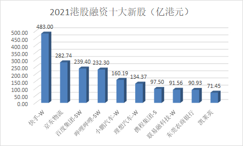 2021年港股共迎来97只新股上市,募资总额3264.11亿港元,其中最大IPO为年初上市的快手,融资总额483亿港元;其次为京东物流,融资额282.74亿港元;百度集团募资239.4亿港元,位列第三;哔哩哔哩募资额也超200亿,小鹏汽车、理想汽车募资额超百亿港元。
