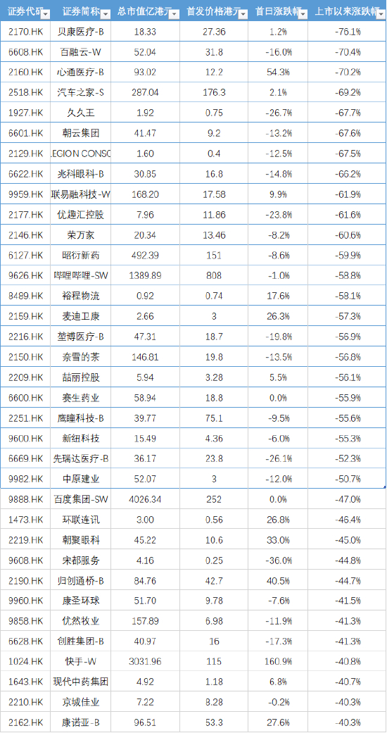 截至12月30日数据,上市首日涨幅最好的是森松国际,涨幅高达258%;其次为诺辉健康的215%和快手的160%。此外,医渡科技、时代天使涨幅也翻倍。首日跌幅榜单中,盈汇企业控股跌超40%,宋都服务跌超36%。