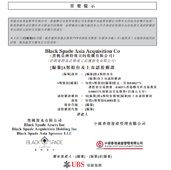 再有SPAC公司向港交所提交上市申请,黑桃亚洲发起人是黑桃资本和中银香港,瑞银集团为独家保荐人。