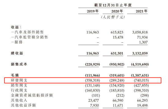根据零跑招股书资料,从2019-2021年,公司研发费用分别为3.58亿元、2.89亿元和7.40亿元,三年合计13.87亿元。同样是造车新势力,蔚来为44.29亿元、24.88亿元、45.92亿元;小鹏汽车为20.70亿元、17.26亿元、41.14亿元。很明显,零跑的研发投入和头部造车新势力有着肉眼可见的差距。