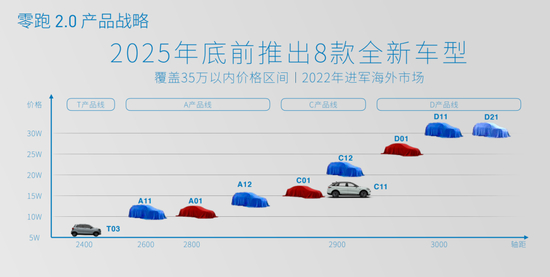 1) 在产品上,到2025年底前,零跑计划推出8款全新车型,全系覆盖35万以内的价格区间,且将在2022年进军海外市场;