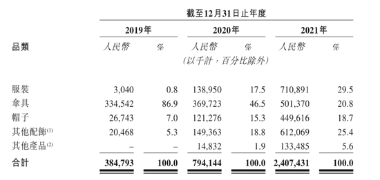 更具体来看,伞具过去三年在总营收的占比大幅降低,2019年至2021年的收入占比分别为86.9%、46.5%和20.8%;相较之下,服装在三年的收入占比分别为0.8%、17.5%和29.5%,现已成为蕉下营收贡献最大的品类,而以鞋履为主的其他产品的收入占比亦在2021年提升至5.6%。
