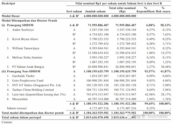 假设超额配售,Tanuwijaya持有1.77%股份,Soelistyo持有0.84%的股份,Aluwi持有0.77%的股份。软银和阿里巴巴分别为8.71%和8.84%。
