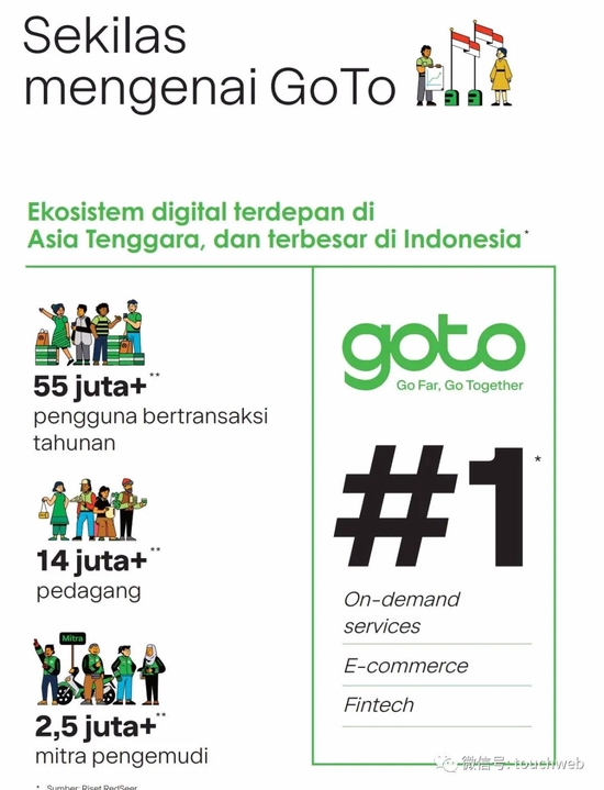 GoTo是东南亚网约车巨头Gojek和电商平台Tokopedia合并后的新公司,公司生态系统包括印尼最大移动服务平台(Gojek)、印尼最大电子商务平台(Tokopedia)和电子支付和金融服务平台GoTo Financial。