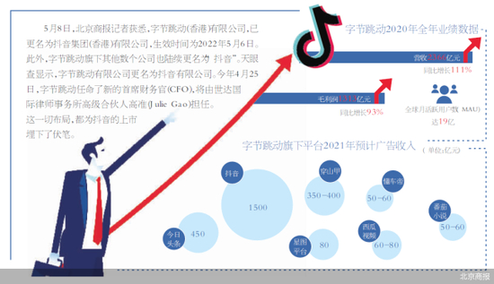5月8日,北京商报记者获悉,字节跳动(香港)有限公司,已更名为抖音集团(香港)有限公司,生效时间为2022年5月6日。此外,字节跳动旗下其他数个公司也陆续更名为“抖音”。天眼查显示,字节跳动有限公司更名为抖音有限公司。今年4月25日,字节跳动任命了新的首席财务官(CFO),将由世达国际律师事务所高级合伙人高准(Julie Gao)担任。这一切布局,都为抖音的上市埋下了伏笔。
