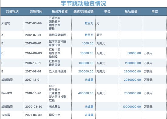 关于融资与股权架构,CVSource投中数据显示,字节跳动自2012年成立以来一共完成了10轮融资,累计金额超70亿美元,基本是以近每年一轮的融资速度发展。2014年6月的C轮融资,投后估值为5亿美元,而到2016年12月的D轮融资,投后估值已经来到110亿美元,此后以每年翻倍的速度增长。