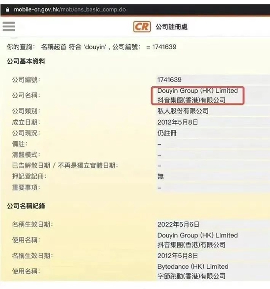 今日(5月8日),香港公司注册处网站显示,字节跳动(香港)有限公司已更名为抖音集团(香港)有限公司,生效时间为2022年5月6日。一时间外界猜测四起,认为抖音或将于香港上市。对此,抖音方面回应:不予置评。