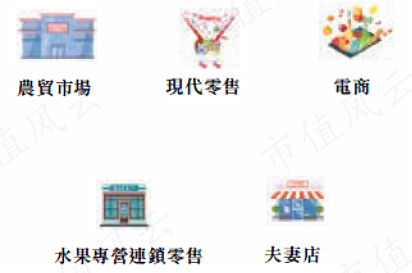 通常,终端消费者可以从以下5个渠道购买水果:农贸市场、现代零售、电商、水果专营连锁零售、水果夫妻店。