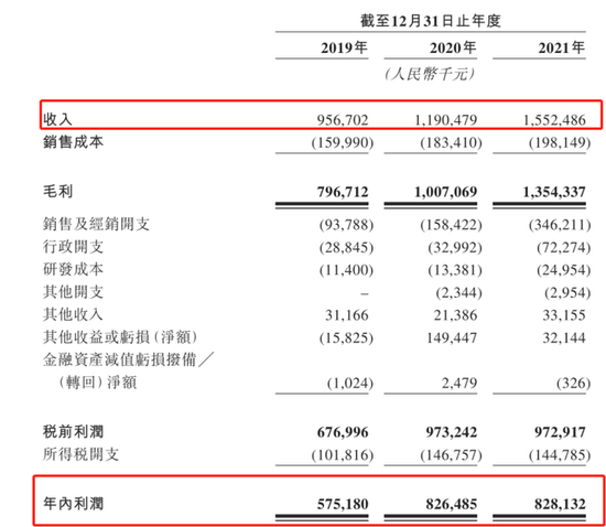 2019年-2021年,巨子生物收入分别为9.57亿、11.9亿、15.52亿,归母净利润分别为5.52亿、8.26亿、8.28亿元,增长势头较为强劲。