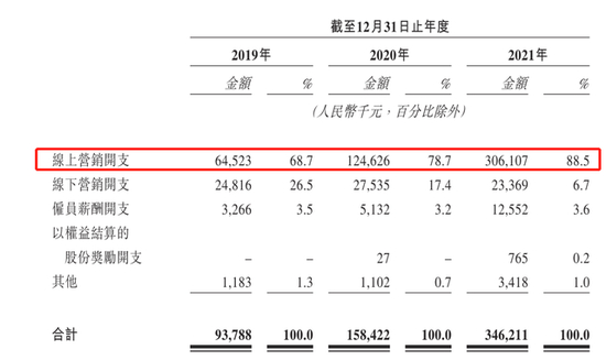 正因为在电商、社交平台上的扩张,这些年巨子生物的销售费用大增。招股书显示,2019年至2021年及2022年前五个月,巨子生物的销售及经销开支分别为9378万元、1.58亿元、3.46亿元和1.96亿元,占总收入的比例分别为9.8%、13.3%、22.3%和27.1%。其中,大部分销售开支用在线上营销上,2021年达到3亿,今年上半年达到1.9亿。