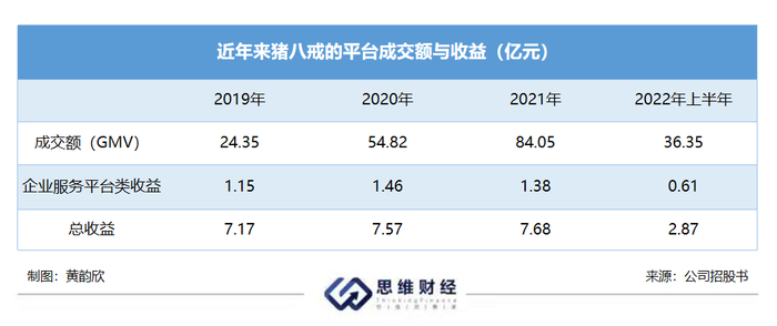而在公司平台成交额高增长的情况下,公司企业服务平台类收益却一直表现平平。2019年至2021年,猪八戒企业服务平台类收益约为1.15亿元、1.46亿元和1.38亿元,2020年企业服务平台类收益同比增长26.96%,2021年却同比降低5.48%。公司整体收益也增幅较低,2019年至2021年,公司总收益分别为7.17亿元、7.57亿元和7.68亿元,2020年、2021年收益分别同比增长5.58%、1.45%。
