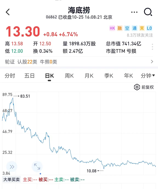 首先是火锅巨头海底捞,一直以优质服务为傲的海底捞,还是没有走出亏损的阴影,自2021年2月最高点83.51港元跌至2022年3月最低点10.08港元,下跌幅度近88%,截至2022年10月25日收盘价13.30港元,当天换手率0.34%来看,交易不活跃是事实,深套投资人也是事实,重回千亿,谈何容易。