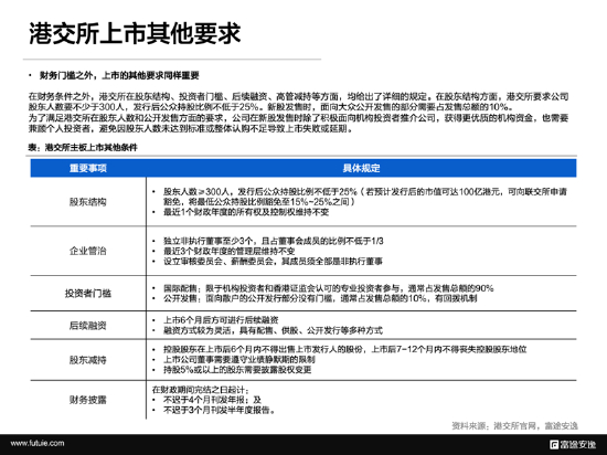 在财务条件之外,港交所在股东结构、投资者门槛、后续融资、高管减持等方面,均给出了详细的规定。在股东结构方面,港交所要求公司股东人数要不少于300人,发行后公众持股比例不低于25%。新股发售时,面向大众公开发售的部分需要占发售总额的10%。