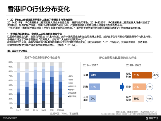 以医疗保健行业为例,在港交所推出18A上市制度,允许未盈利的生物科技公司来港上市后,越多越多生物科技公司首选香港作为其上市地。香港由此成为了仅次于美国的“亚洲最大、全球第二大生物科技集资中心”。