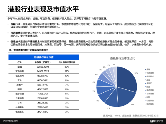 从行业分布来看,金融、可选消费、信息技术三大行业,支撑起了港股61%的市值比重。