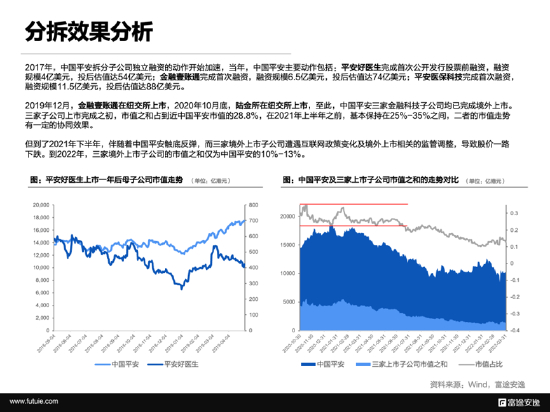2017年,中国平安拆分子公司独立融资的动作开始加速,当年,中国平安主要动作包括:平安好医生完成首次公开发行股票前融资,融资规模4亿美元,投后估值达54亿美元;金融壹账通完成首次融资,融资规模6.5亿美元,投后估值达74亿美元;平安医保科技完成首次融资,融资规模11.5亿美元,投后估值达88亿美元。