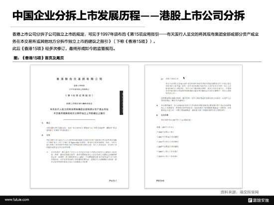 与A股分拆波折的监管发展历程相比,香港上市公司分拆的相关规定则简单及完善很多。香港上市公司分拆子公司独立上市的规定,可见于1997年颁布的《第15项应用指引——有关发行人呈交的将其现有集团全部或部分资产或业务在本交易所或其他地方分拆作独立上市的建议之指引》(下称《香港15》)。