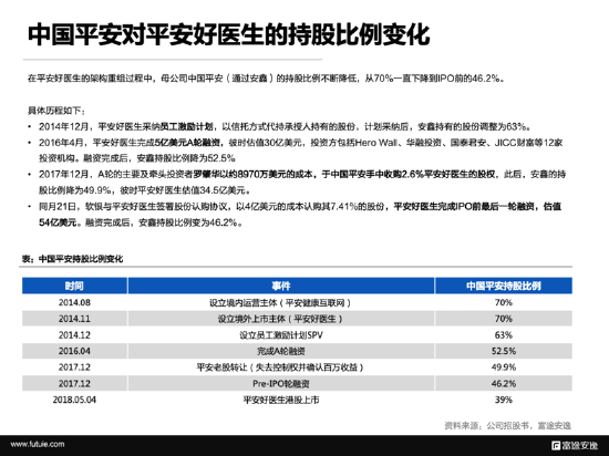 在平安好医生的架构重组过程中,母公司中国平安(通过安鑫)的持股比例不断降低,从70%一直下降到IPO前的46.2%。